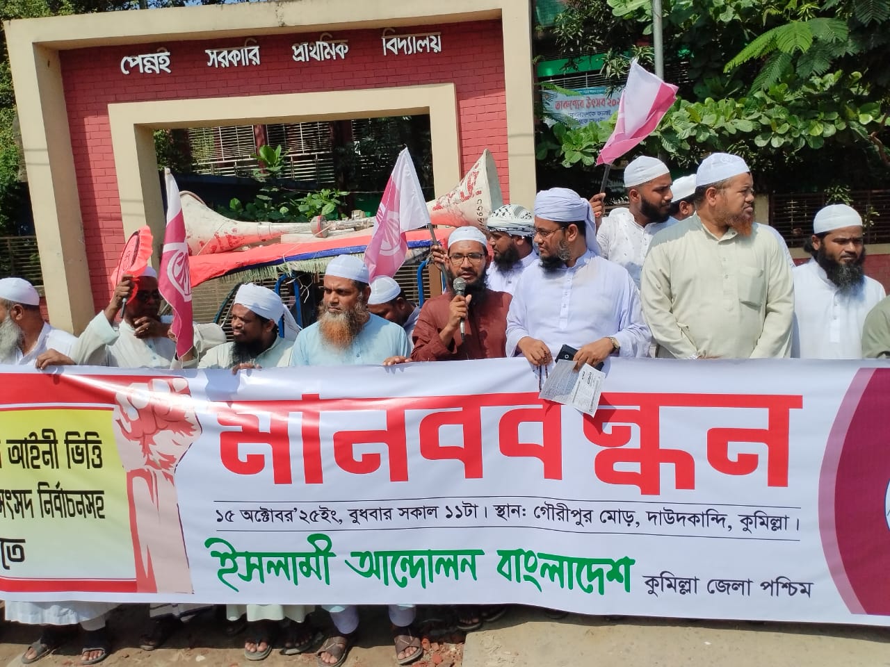 ইসলামী আন্দোলন বাংলাদেশ কুমিল্লা পশ্চিম জেলা শাখার উদ্যোগে আজ অনুষ্ঠিত হলো এক বিশাল মানববন্ধন কর্মসূচি, যেখানে জাতীয় সনদের আইনি ভিত্তি প্রতিষ্ঠা ও পিআর (Proportional Representation) পদ্ধতিতে জাতীয় সংসদ নির্বাচনসহ পাঁচ দফা বাস্তবায়নের দাবিতে জনতার দৃপ্ত আওয়াজ উঠে আসে।
