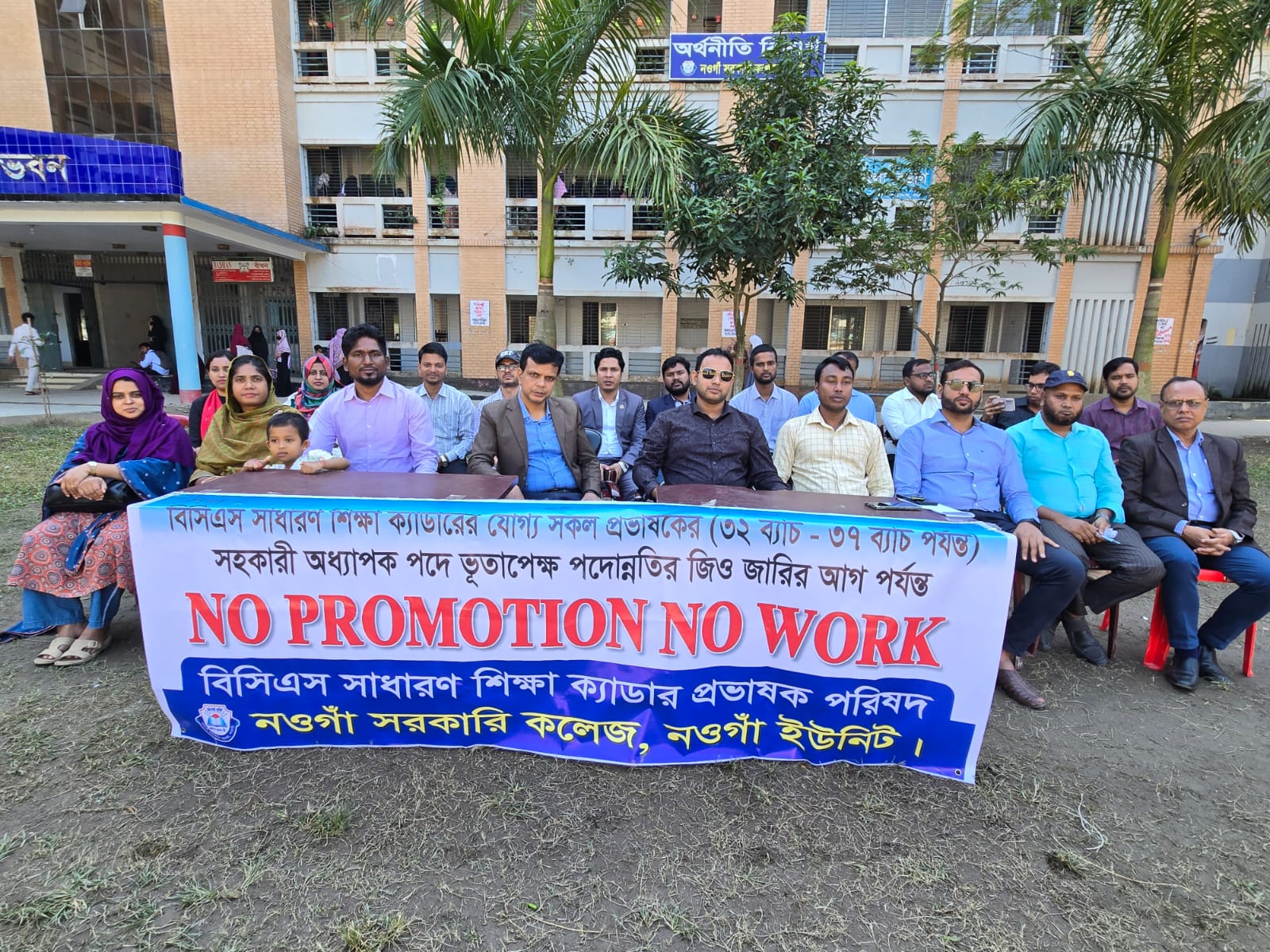 বিসিএস শিক্ষা ক্যাডারের যোগ্য সকল প্রভাষকের সহকারী অধ্যাপক পদে পদোন্নতির দাবিতে টানা তৃতীয় দিনের মতো ক্লাস ও পরীক্ষা বর্জন কর্মসূচী পালন করছেন নওগাঁর শিক্ষকরা। মঙ্গলবার নওগাঁ সরকারি কলেজ প্রশাসনিক ভবনের সামনে ৩২ থেকে ৩৭ ব্যাচ পর্যন্ত সকল শিক্ষককে ভূতাপেক্ষ পদোন্নতির জিও জারির দাবিতে এ কর্মসূচী পালন করছেন তাঁরা।