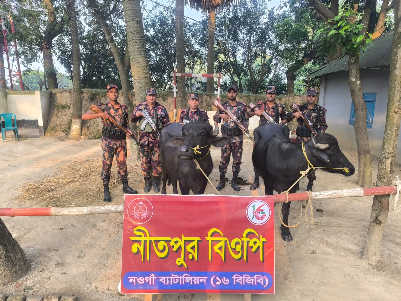 নওগাঁর পোরশা সীমান্তে নওগাঁ ব্যাটালিয়ন (১৬ বিজিবি) নিতপুর বিওপির টহল দল মালিক বিহীন ভারতীয় দুটি মহিষ আটক করেছেন। আরআইবি এবং সিভিল সোর্স এর তথ্যের ভিত্তিতে রবিবার রাত সাড়ে ১১টার দিকে ব্যাটালিয়নের অধীনস্থ নিতপুর বিওপির সীমান্ত মেইন পিলার ২৩১/৫ এস হতে আনুমানিক ০২ কিলোমিটার বাংলাদেশের অভ্যন্তরে হবুর মোড় আম বাগানের ভিতর থেকে মহিষ দুটি আটক করা হয়। এতে নেতৃত্ব দেন নায়েব সুবেদার মুহাম্মদ আলী খান। মাঝারি ভারতীয় মহিষ দুটির আনুমানিক মূল্য ৪ লক্ষ টাক। পরে মহিষ দুটি কাস্টমে জমা দেওয়া হয়েছে। বিষয়টি নিতপুর ১৬/ডি কোম্পানী কমান্ডার সুবেদার মোঃ আব্দুল আওয়াল নিশ্চিত করেছেন।