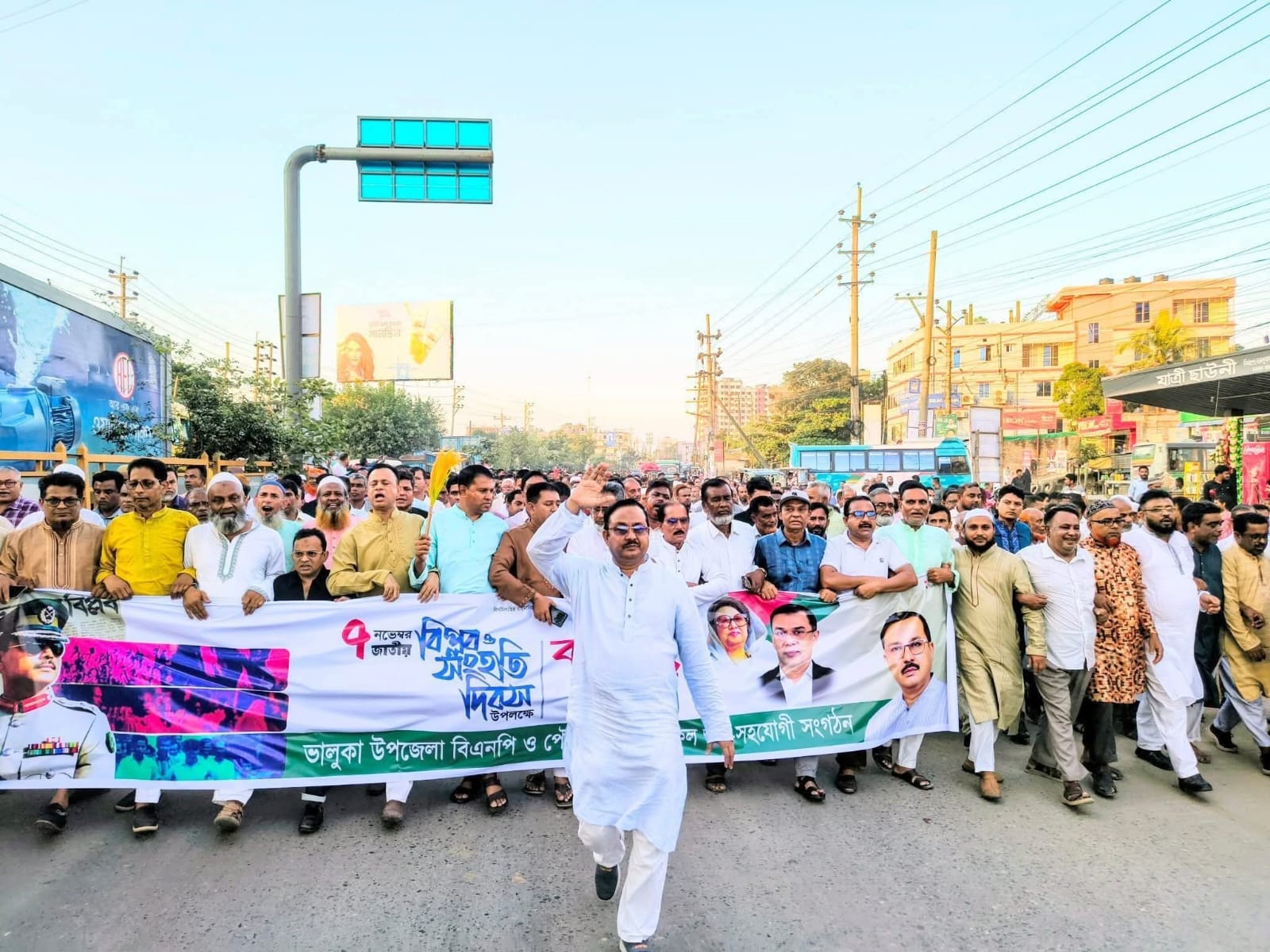 ঐতিহাসিক ৭ নভেম্বর জাতীয় বিপ্লব ও সংহতি দিবস উপলক্ষে ভালুকা উপজেলা ও পৌর বিএনপির উদ্যোগে বর্ণাঢ্য র্যালি ও আলোচনা অনুষ্ঠিত হয়েছে। এতে নেতৃত্ব দেন ময়মনসিংহ-১১ (ভালুকা) আসনের বিএনপির মনোনীত প্রার্থী, বিএনপির জাতীয় নির্বাহী কমিটির সাবেক সদস্য ও ভালুকা উপজেলা বিএনপির সাবেক সভাপতি ফখরউদ্দিন আহামেদ বাচ্চু।