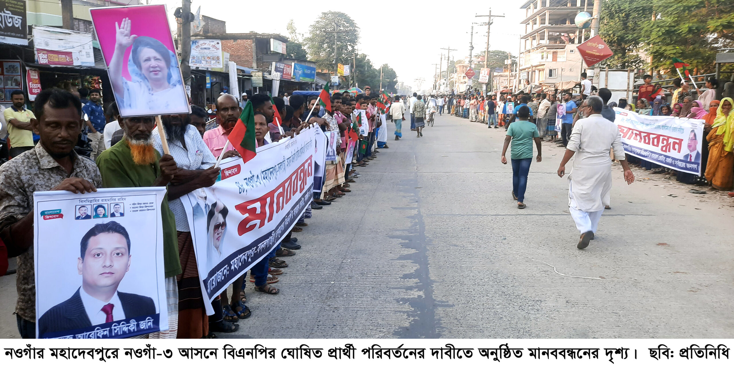 মহাদেবপুরে বিএনপির ঘোষিত প্রার্থী পরিবর্তনের দাবীতে মানববন্ধন