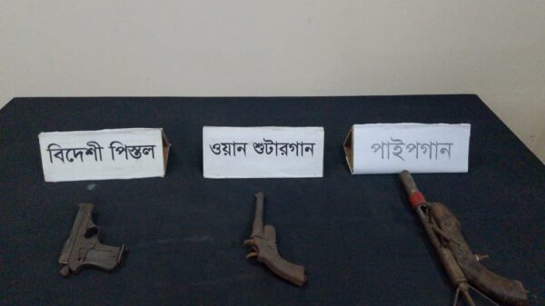 আল রোকন রিপোর্টার কুমিল্লা বর্ডার গার্ড বাংলাদেশ (বিজিবি) কুমিল্লা ব্যাটালিয়ন (১০ বিজিবি) সীমান্ত নিরাপত্তা ও চোরাচালান প্রতিরোধে নিয়মিত অভিযান পরিচালনার অংশ হিসেবে এক বিশেষ অভিযানে দুইটি বিদেশী পিস্তল, দুইটি ম্যাগাজিন,