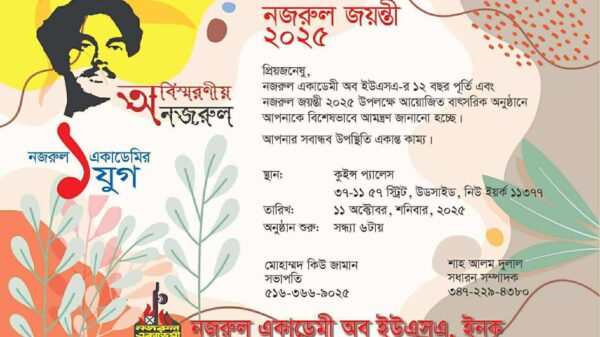 হাকিকুল ইসলাম খোকন,বাপসনিউজ বাংলাদেশের জাতীয় কবি কাজী নজরুল ইসলামের জন্মজয়ন্তী ও নজরুল একাডেমি অব ইউএসএ,এর প্রতিষ্ঠার এক যুগ পূর্তি উপলক্ষে আগামী ১১ অক্টোবর ২০২৫, শনিবার নিউইয়র্কের উডসাইডের কুইন্স প্যালেস-এ একটি